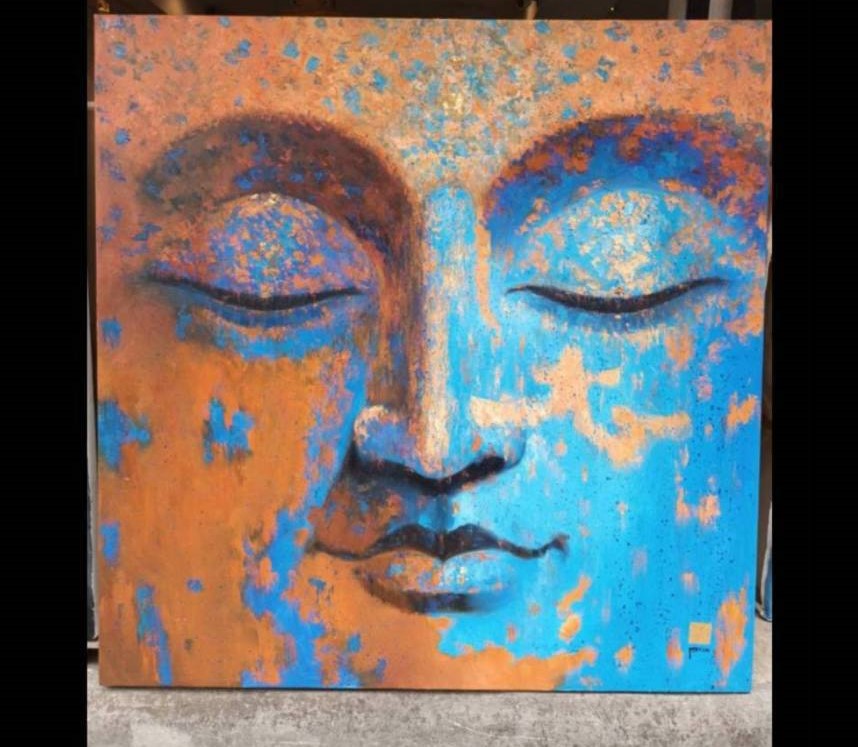 Bring harmony and tranquility to your space with this blue and brown Buddha face painting, beautifully blending calming blue hues with warm earthy browns