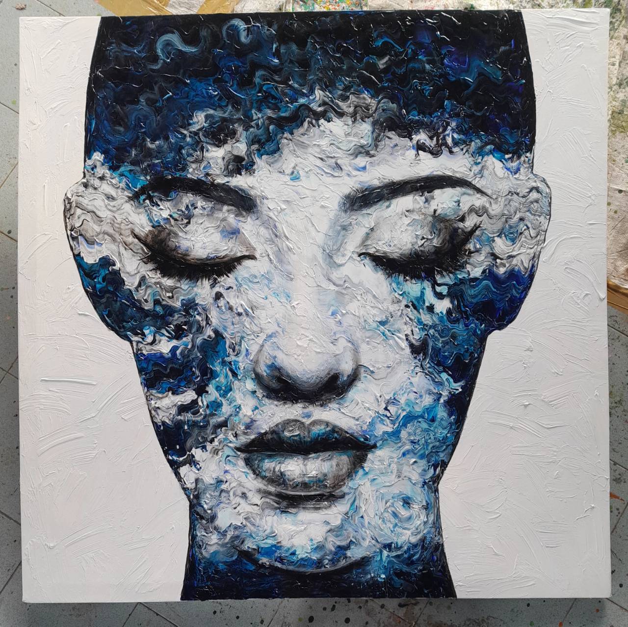 Featuring bold brush strokes and flowing forms in soothing blue and crisp white tones, this artwork captures the essence of femininity and emotion through a contemporary lens.