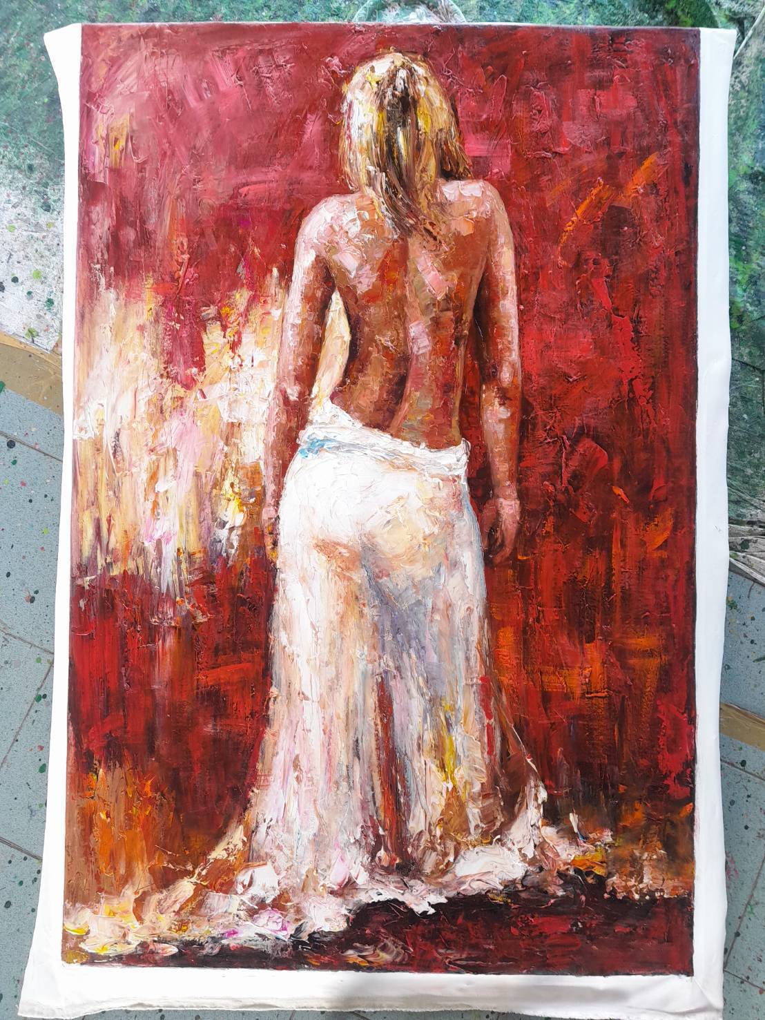 Featuring rich crimson tones and expressive brushstrokes, this artwork captures the elegant curve of the female form with a bold, emotional flair