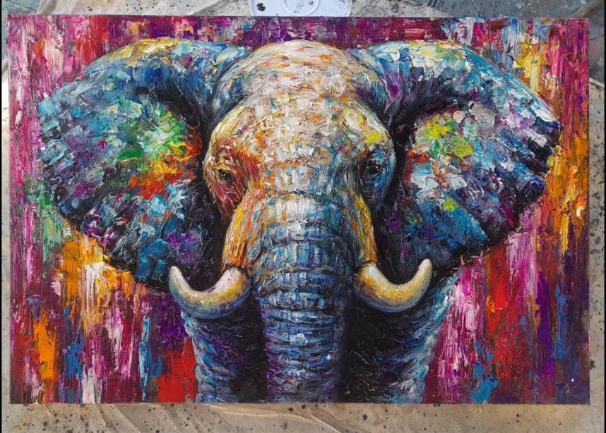 This vibrant painting features a mighty elephant set against a dazzling rainbow backdrop, celebrating the beauty and diversity of nature