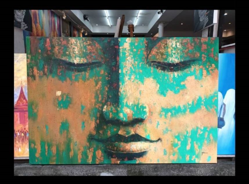 Elevate your space with this captivating green and gold Buddha face painting, combining lush green tones with shimmering gold accents to symbolize growth, prosperity, and spiritual enlightenment