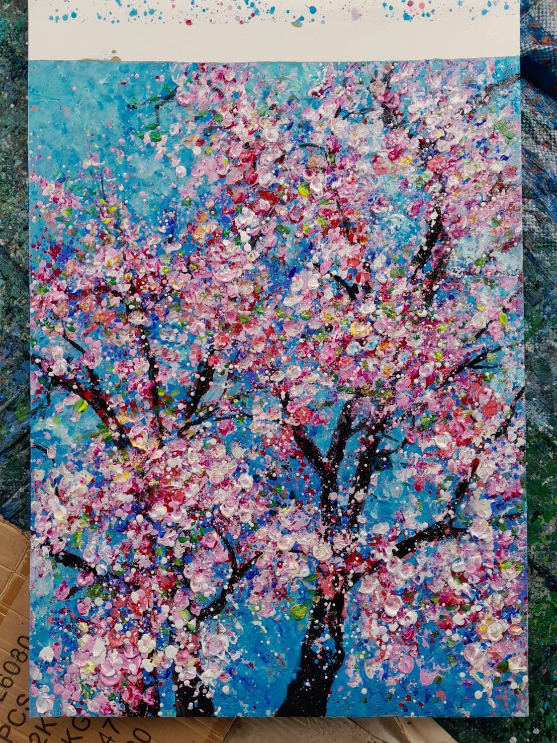 A striking abstract composition featuring dabs of pink that come together to form the silhouette of a tree
