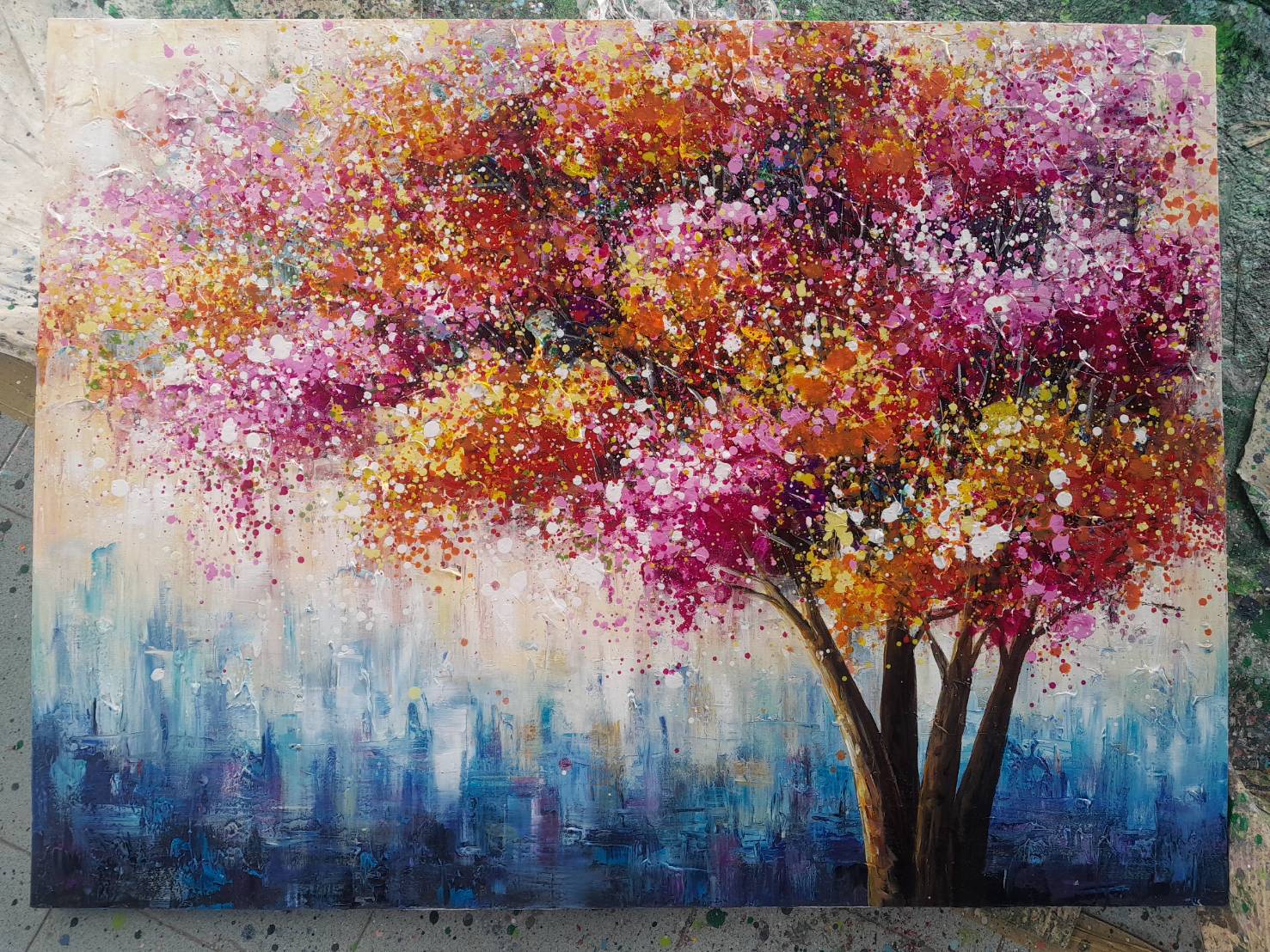 An abstract depiction of a tree with vibrant red and orange hues, capturing the essence of autumn